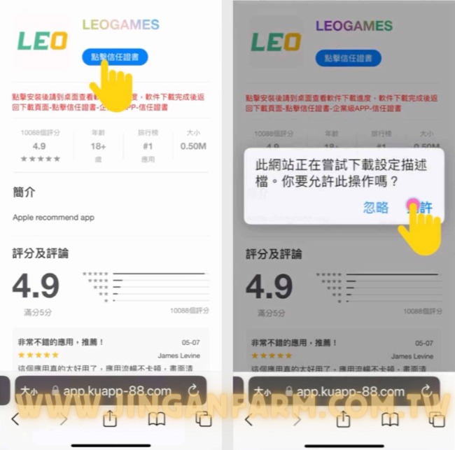 Step3.按「點擊信任證書」選項,接著會詢問是否下載設定描述檔,選擇「允許」。