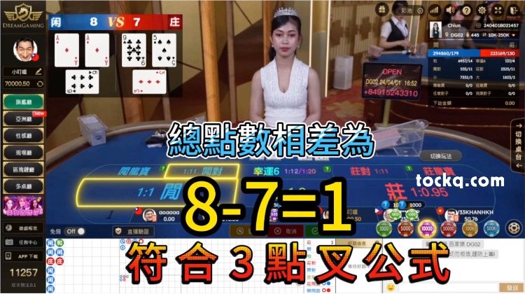 確定點數差:每局結束後,計算閒家和莊家之間的點數差。點數差是兩者點數的差值。例如,如果閒家8點,莊家9點,則點數差為1(9 - 8 = 1)。